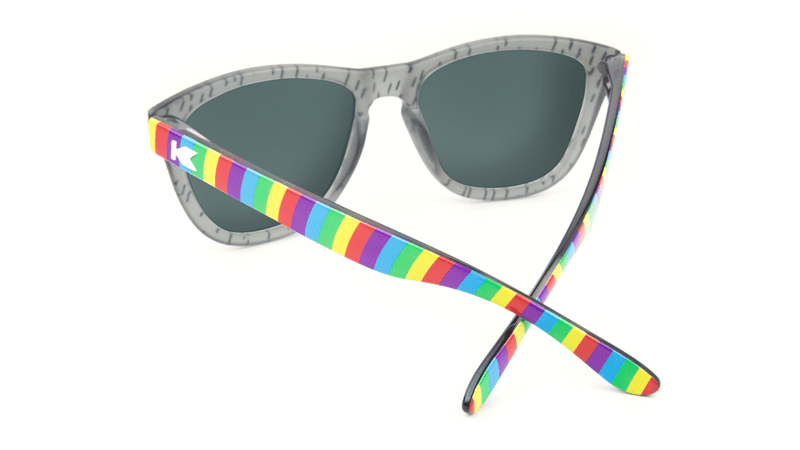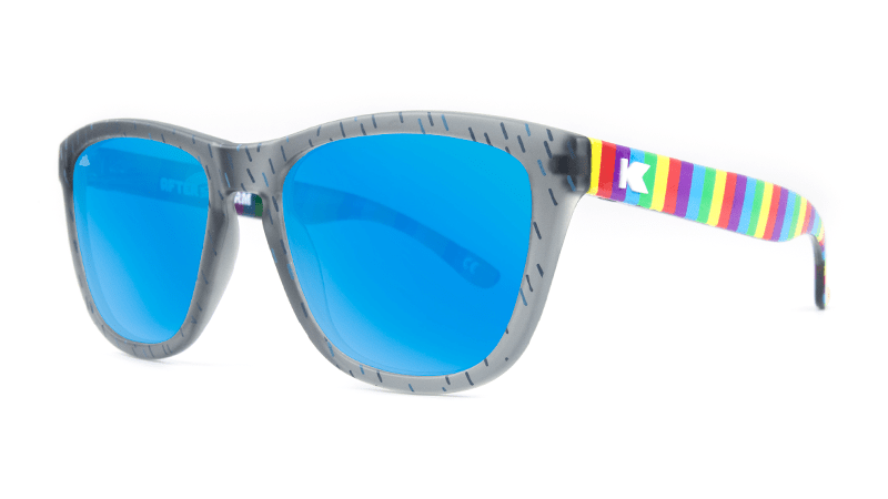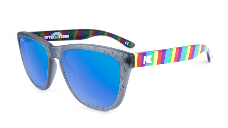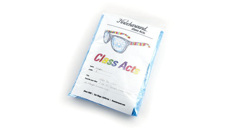 Jayden’s unique sunglasses feature frosted Rainstorm Grey fronts, Cloudbreak Blue lenses, and rainbow covered arms. Pulling inspiration from Jayden’s original drawing, a small cloud logo has been laser etched on the upper corner of the left lens. Each pair also comes with a Knockaround sticker, grass green microfiber pouch, and a blue poncho (to tide you over until the rainbow appears.)