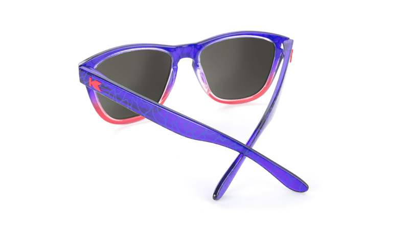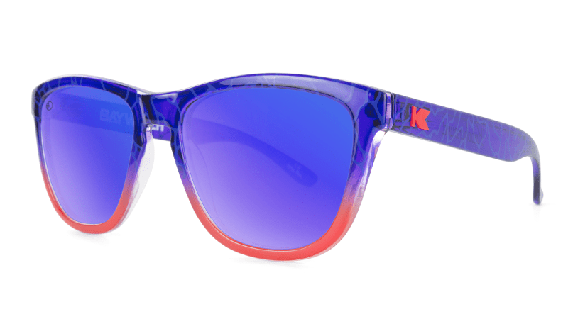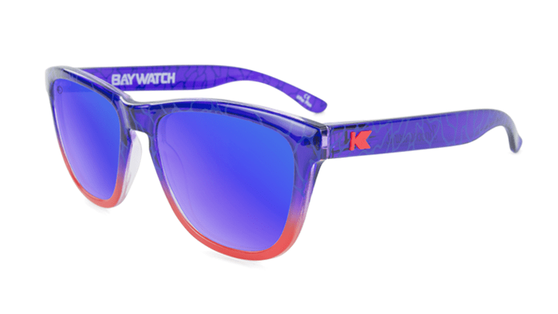 The Baywatch Premiums feature a translucent bay blue frame with a water ripple print on the outside, fronts that gradate to a rescue red, matching red flag K logos, and polarized EMS blue lenses with a lifeguard tower lens etch. Designed on our best-selling frame, these sunglasses are form-fitting, universally flattering, and provide full UV400 sun protection.