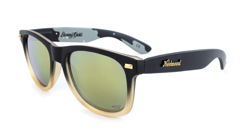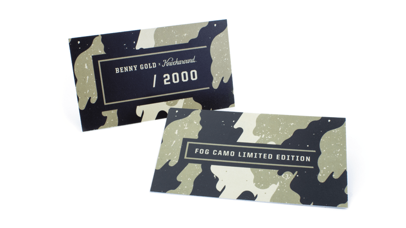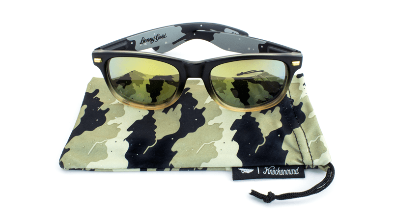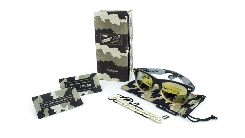 Knockaround and Benny Gold have teamed up again to create the Limited Edition Fog Camo Fort Knocks. Incorporating Benny Gold’s signature fog camo pattern, these sunglasses feature a black to tan frosted gradient finish, gold accent hardware, and paper plane lens etch. Each pair comes with a matching microfiber pouch, fog camo logo sticker, and a hand-numbered edition card.  2000 pairs were created. 750 pairs were available at the beginning of October 2014 on Knockaround.com. 500 pairs were available on BennyGold.com and in Benny Gold’s San Francisco shop. The final 750 pairs will be available on Knockaround.com on Black Friday. Only $35