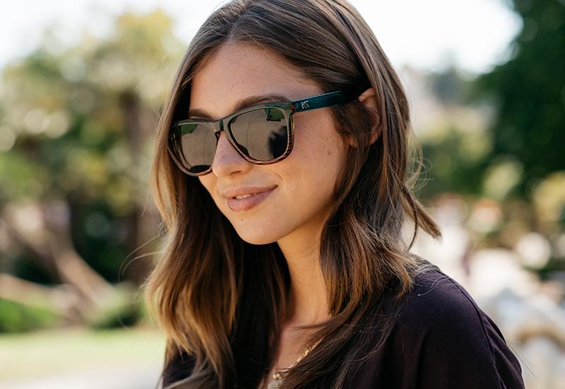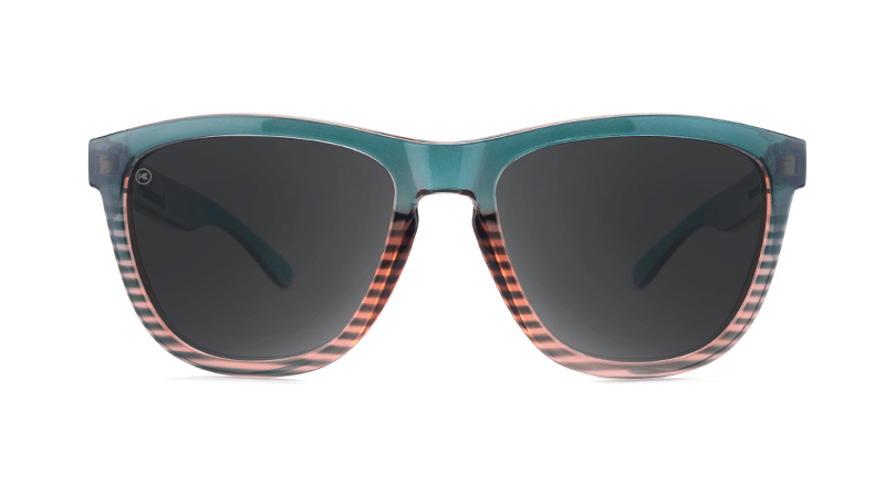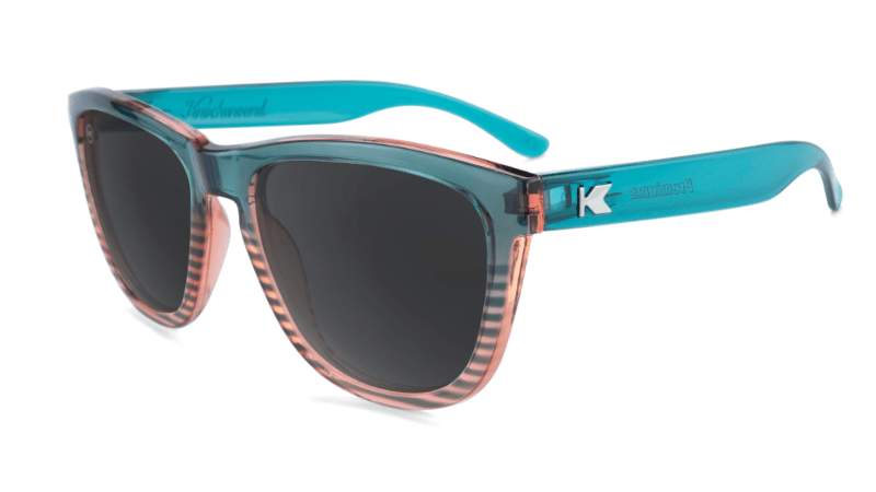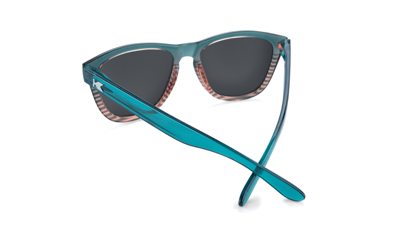 There’s always a moment before the sun dips down below the horizon when the light scatters off the water, sending out soft, brilliant rays of pink and orange. Relive that mesmerizing moment every time you slip on these translucent turquoise and coral sunglasses, featuring black smoke lenses (polarized option available) and silver “K” logos on the outside of each arm.