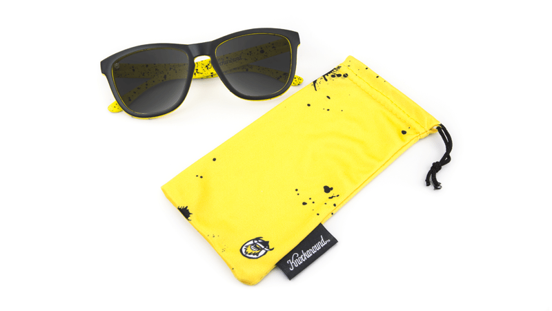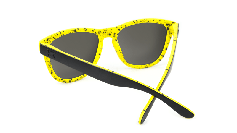 - Matte black outer frames with a yellow and black splatter print on the inside