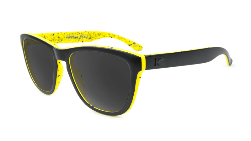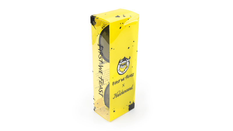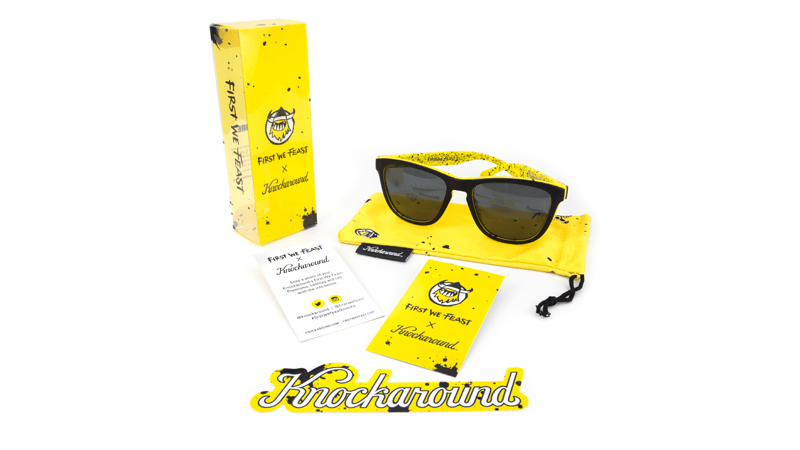 The First We Feast Premiums feature matte black outer frames with glossy black tonal K logos, the signature First We Feast yellow and black splatter print on the inside, and polarized smoke lenses with a First We Feast logo lens-etch. Each pair comes packed with a matching yellow and black splatter print microfiber pouch, a custom Knockaround sticker, and collector’s card, inside a custom box. Limited quantities are available.