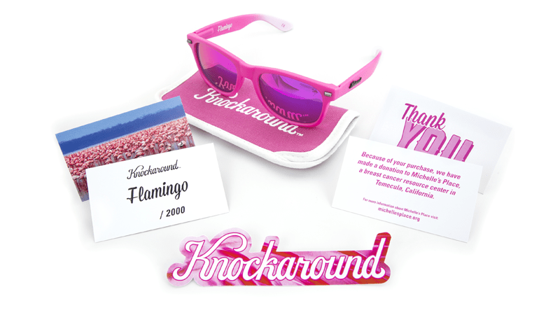 Featuring matte pink frames, dark grey hardware, and a laser-etched flamingo on the lens, the Limited Edition Flamingo Fort Knocks sunglasses are sure to make your friends stand up on one leg! Each pair comes with a flamingo inspired sticker, bright pink soft case, and a hand-numbered edition card. But here’s the best part: Knockaround is donating 100% of the profits from the sale of these sunglasses to Michelle’s Place, a breast cancer resource center in Temecula, California. By working with a local organization we are able to make a huge impact on a local community. So purchase a pair of Flamingo Fort Knocks for only $35, and help support a great cause!