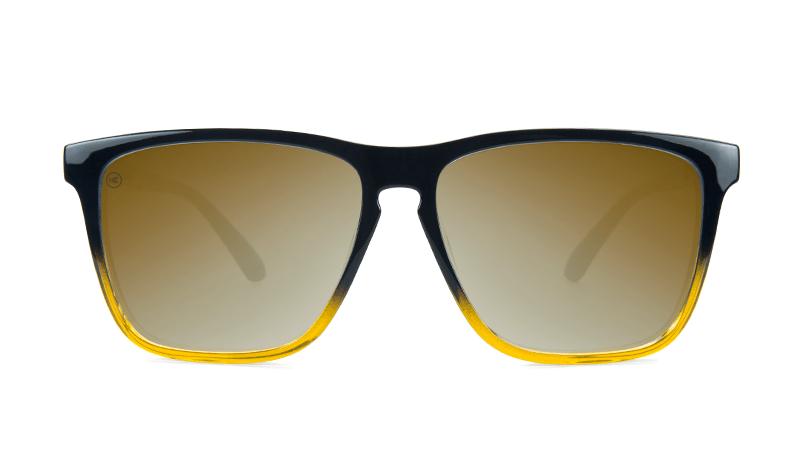 The ideal accessory for a long road trip or a cruise down the coast, Knockaround Fast Lanes feature a clean-cut, rectangular silhouette that’s ideal for medium to larger face shapes. These sunglasses will kick your style into high gear with glossy black and amber ice frames, paired with gold reflective lenses and our white “K” logos embedded on each arm. Polarize your Fast Lanes for an extra $5.