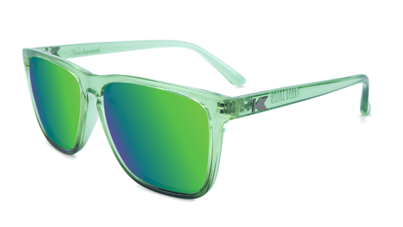 Ideal for medium to larger face shapes, Knockaround Fast Lanes are the perfect companions for a long road trip or a cruise down the coast. These high-speed sunglasses feature a clean-cut, rectangular silhouette and our “K” logos embedded on the arms. We’ve put a futuristic spin on this pair with glossy juniper fade frames and green moonshine lenses, which can be polarized for an additional $5.