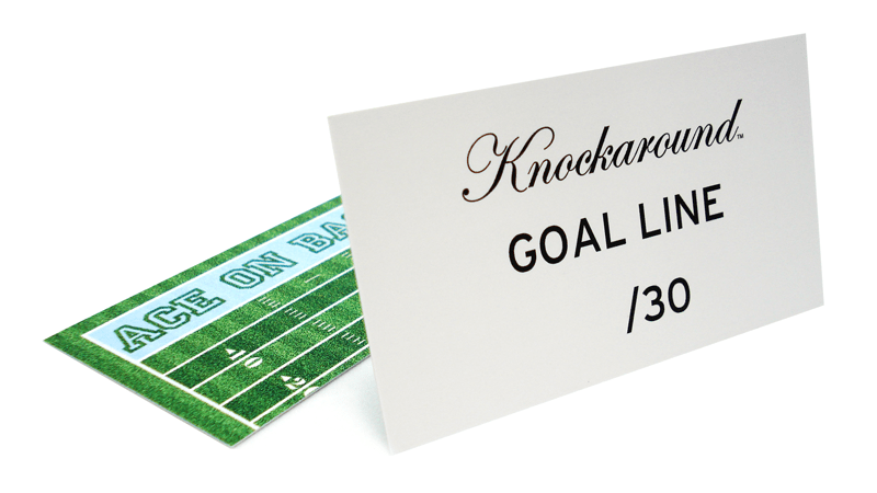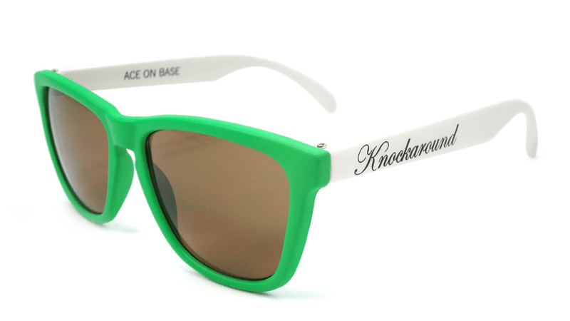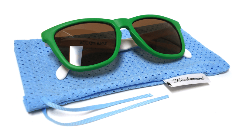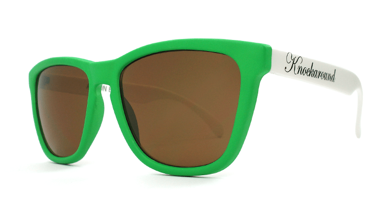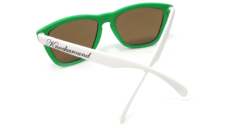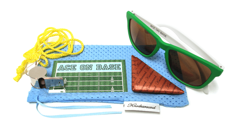In addition to all the normal features of Knockaround Premiums, Goal Line Premiums feature grass green fronts, white arms, and amber lenses. Only thirty pairs were produced; each pair comes with a numbered edition card, a hand-folded, copper-tinted paper football, and a ref's whistle (so you can keep your opponent in check). Everything is sealed nicely in a powder blue, mesh jersey pouch. All right, now buttonhook left on three...hut, hut...HIKE!