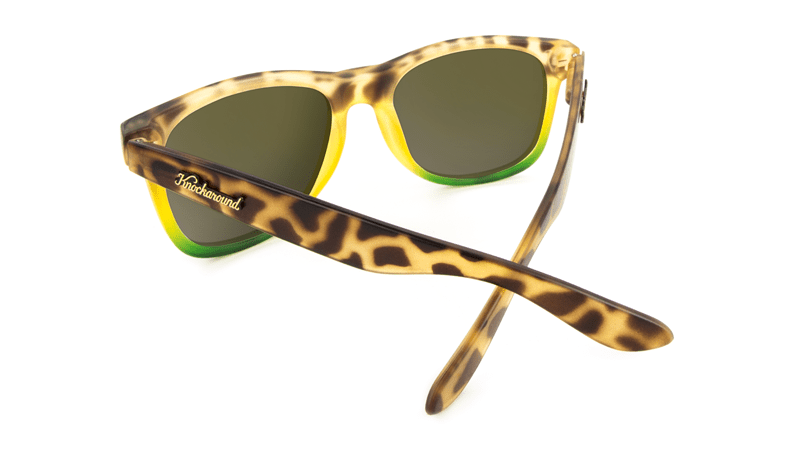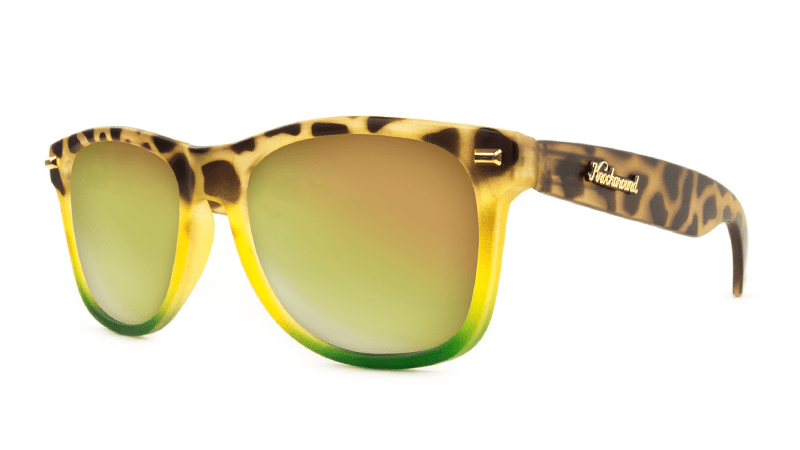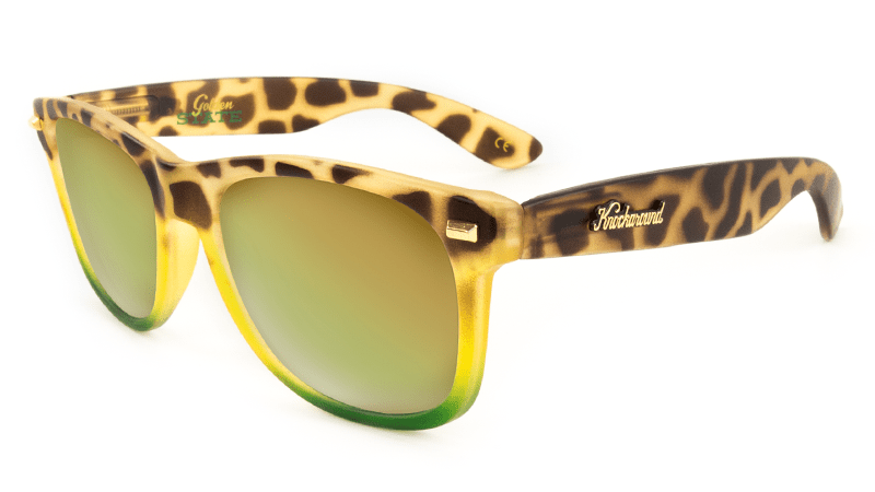 Only 1,000 pairs were made and feature matte desert tortoise shell fronts that fade to yellow and green, gold accent hardware, and Cabrillo Gold mirrored lenses. Each pair comes with a green and white California highway sign inspired protective pouch, a California table top flag, and the very postcard that inspired these shades. Trust us, these Golden State Fort Knocks are definitely something to write home about.