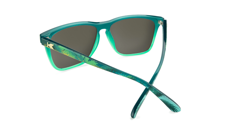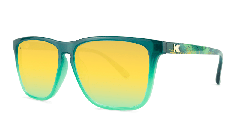 The Green Flash Fast Lanes are seriously slick. The front frame’s jelly colors fade from emerald at the bottom to deep-sea green up top. This deep-sea green continues as the interior base of the arms, while the exteriors resemble something you'd see out your car window while cruising the PCH during golden hour. And like little sunset splashes, a speckled layer of gold and light blue provide a backdrop for the palm tree lined arms. Shimmering gold lenses and gold K logos round out these cool, yet laid back pair of shades.