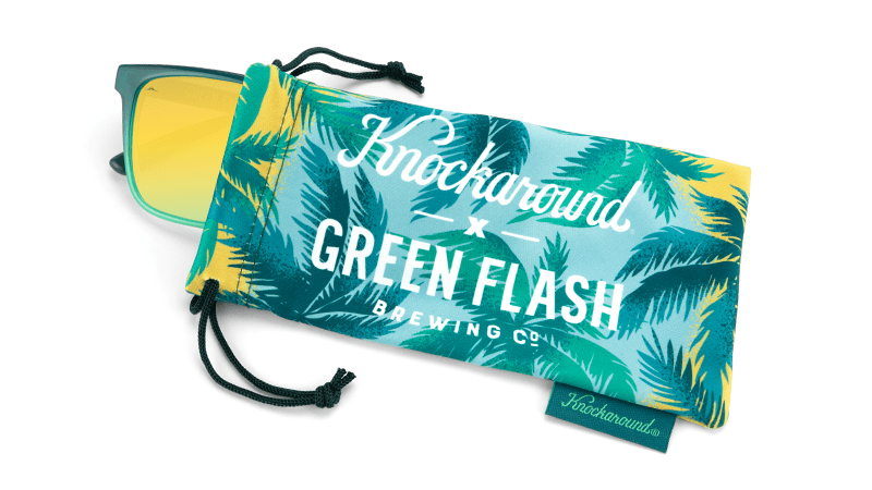 - Co-branded Green Flash X Knockaround protective, sunset palm pouch
