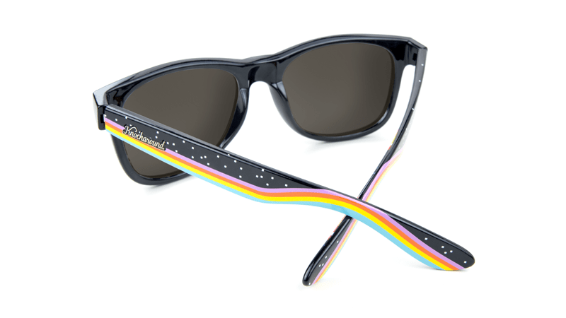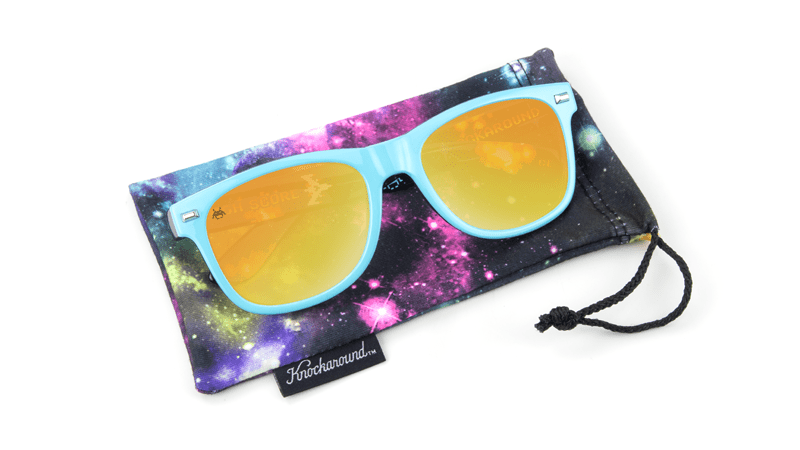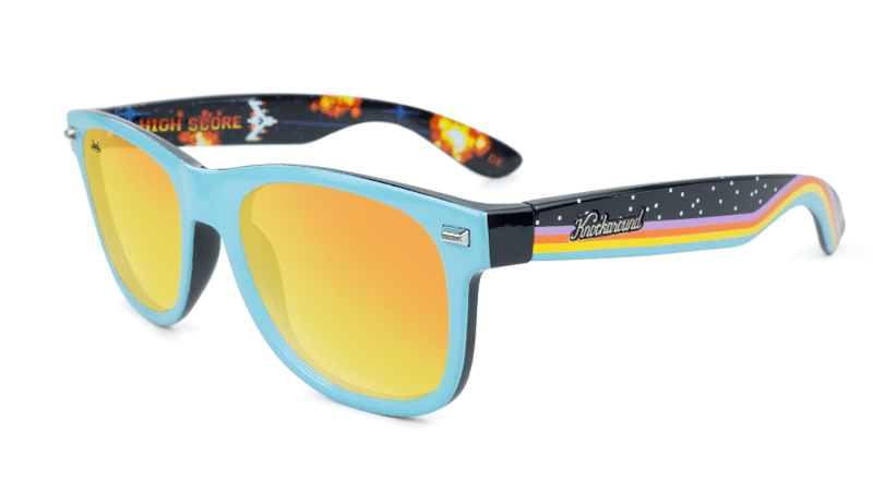 The High Score Fort Knocks feature a glossy black frame base with an 8-bit space battle interior, galactic streamers that run down the outside of each arm, cooldown-blue fronts, and coin-op silver hardware. Polarized cyber sunset lenses with an alien invader lens etch rounds out these single-player shades. Designed on Knockaround’s Fort Knocks frame, these sunglasses have a slightly wider, more universal fit and provide full UV400 sun protection.
