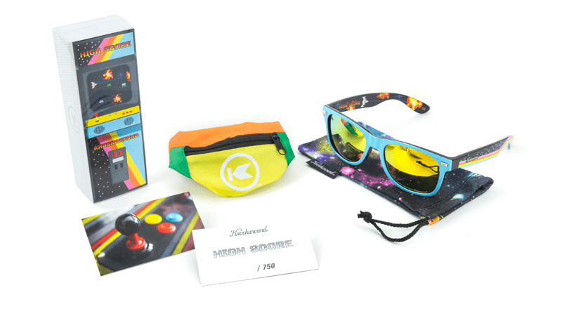 Each pair is packed in a Knockaround arcade cabinet box with a protective cosmic case and Limited Edition card. Hold up…here’s the High Score bonus, every set comes with your very own neon wrist fanny pack. How’s that for a throwback!? And if that wasn’t enough, we pre-packed each wrist fanny with a quarter to get you going on your joystick domination!