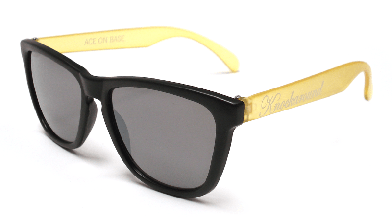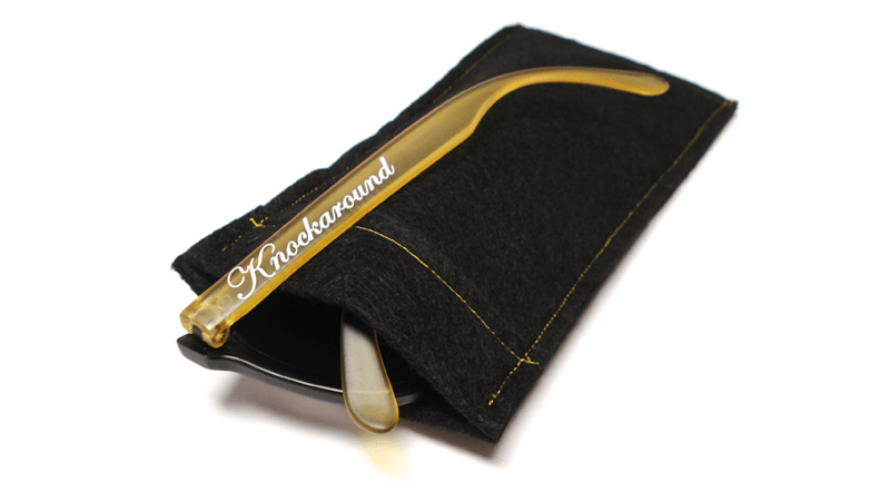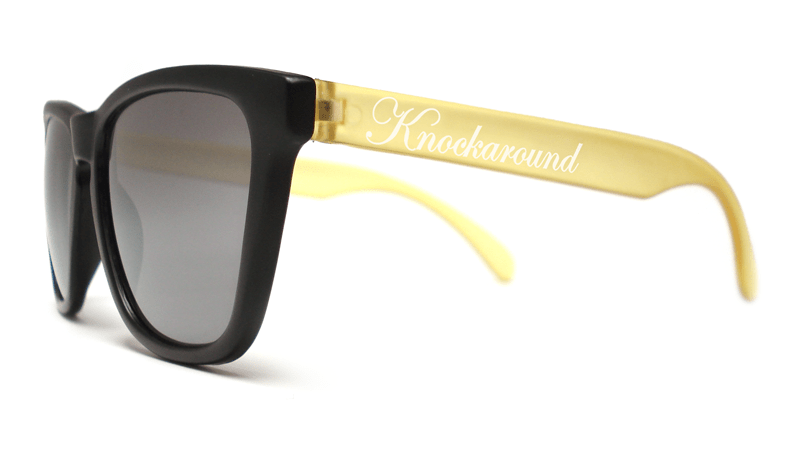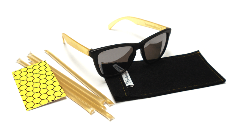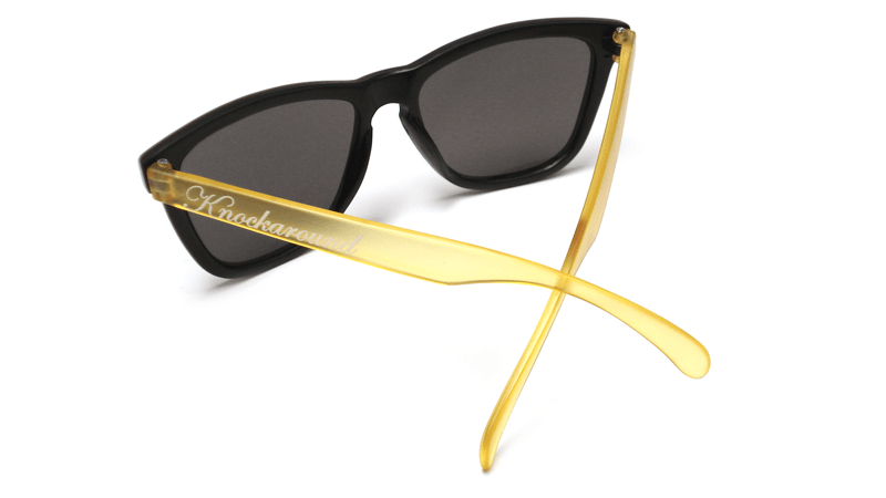 Our Limited Edition Honeybee Premiums feature smoke lenses, black fronts, and frosted yellow arms with a white Knockaround logo. Get 'em fast, because only 100 pairs will be made; each comes with a black felt pouch, a numbered edition card, and some honey sticks filled with genuine, grade-A star thistle honey. Sweet.