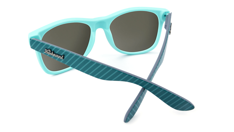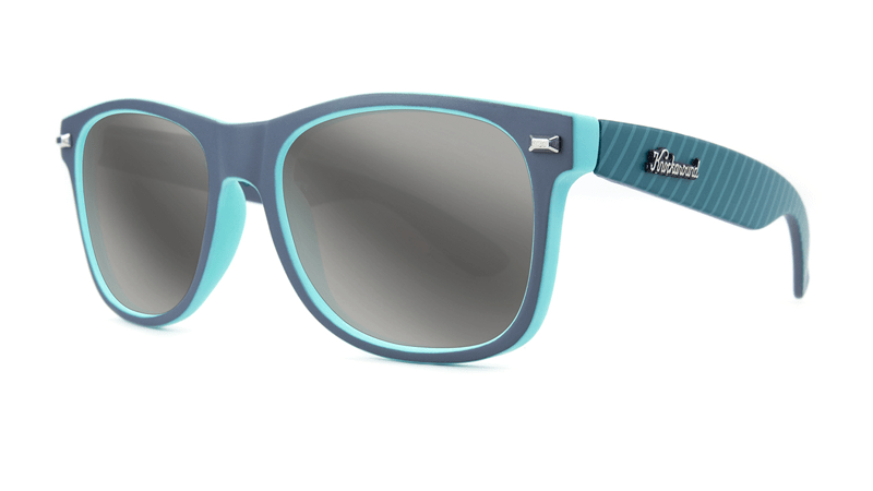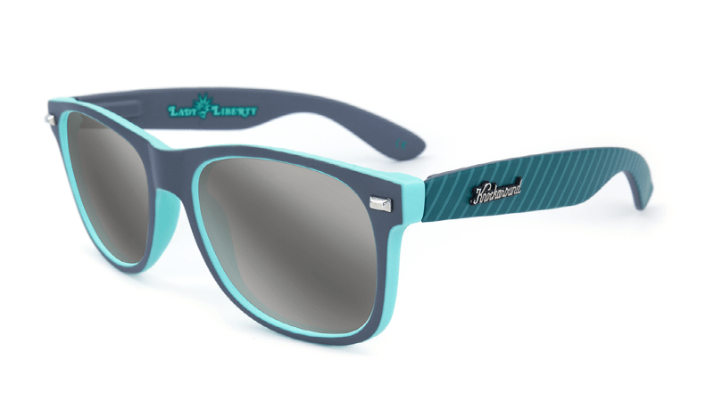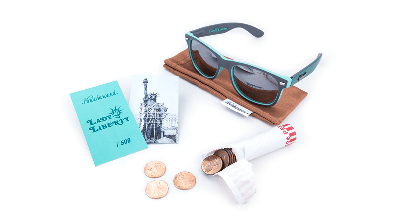 Our Lady Liberty Fort Knocks feature Freedom Grey fronts with a Patina Green interior, Patina Green tonal stripes on Freedom Grey arms, silver hardware, and Silver Smoke lenses. Each pair comes with a “copper” protective pouch, a roll of copper pennies, and hand-numbered edition card.