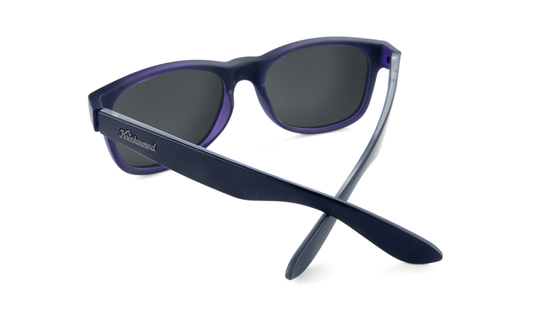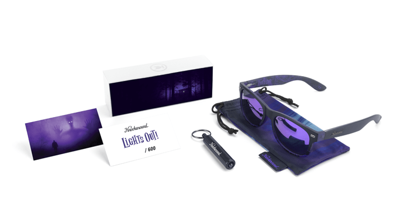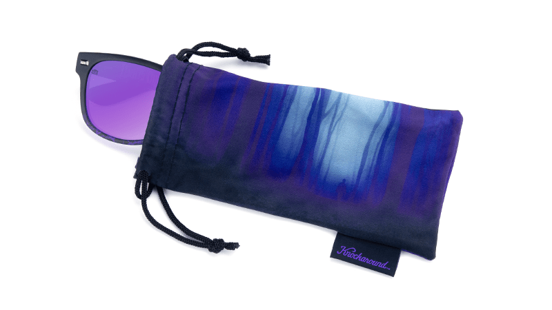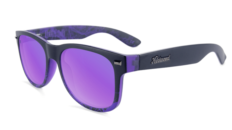 The Lights Out! Fort Knocks feature a matte midnight black exterior frame with an ominous purple, wooded interior, which wraps around to the bottom part of the front frame. Supernatural polarized purple lenses with a foreboding owl lens etch and gunmetal hardware round out these uncanny shades.