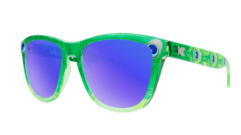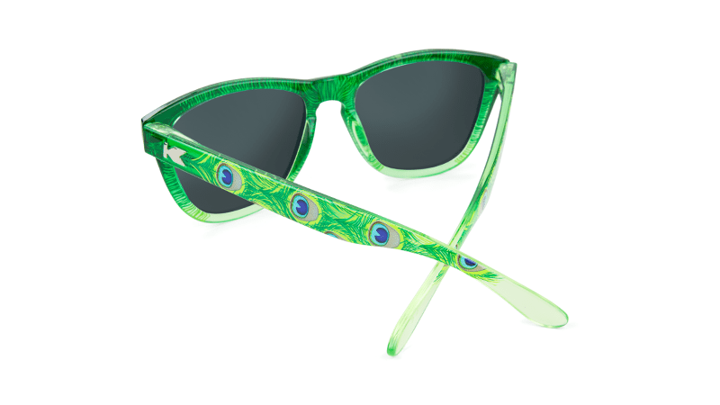 Lilli's unique design features an eye-spotted tail feather print on an iridescent green frame (that fades from dark to light), and brilliant blue polarized lenses. Pulling inspiration from Lilli's original drawing, the Peacock Life Premiums showboat details like the piercing silver K logos and a peacock logo laser etched on the left lens.